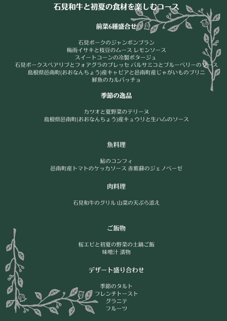 豪華ですね!デザートにも邑南のフルーツを手配中とのこと。初夏を味わう食材をふんだんに使ったフルコースです!